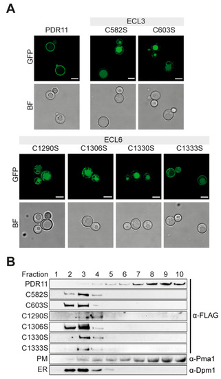 Expression of the single cysteine mutants resulted in intracellular retention and increased degradation. This result implies that correct disulfide bond formation between the extracellular loop cysteines is important for stabilizing the protein structure. Native disulfide bonds were also found to be important for the structural integrity and cell surface trafficking in other ABC transporters. For the human transporters, ABCB6, and sulfonylurea receptor 1 (SUR1)/ABCC8, the disruption of disulfide bonds results in protein degeneration [21]. A similar stabilizing effect of an intramolecular disulfide bond was reported for the human ABC transporter ABCG2 [6,7,22,23]. It is noteworthy that the two disulfide-bond-forming cysteine residues of ABCG2, C592, and C608, are located in the ECL of the transporter at close-by positions to the cysteine residues C582 and C603 of Pdr11p. Similar to the Pdr11p residues, mutation of C592 and C608 in ABCG2 results in trafficking defects and altered functionality [6]. Moreover, removal of cysteine residues not involved in disulfide bond formation can also lead to impaired trafficking and mislocalization of the ABC transporter protein, as shown for several membrane transporters [6,24,25].