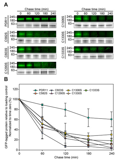 3.3. Single Cysteine Mutations Affect Trafficking of Pdr11p to the Plasma Membrane and Protein Stability