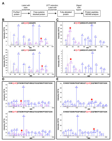 MS/MS spectra of peptide adducts obtained by a tryptic digest of Pdr11p. (A) Experimental flow chart for the chemical modification strategy and subsequent mass spectrometry-based identification of alkylated protein adducts. (B–E) Four cysteines (B, C582; C, C603; D, C1290; E, C1306) were identified with two kinds of adducts, indicating their potential involvement in disulfide bonds. Red arrows indicate the representative product ions with 14-Da mass differences by comparing the upper and lower spectra of each peptide.