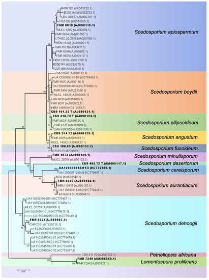 With the establishment of the “One Fungus = One Name” rule in fungal taxonomy which allows only a single name per fungus [14] the genus name “Scedosporium” was retained at the expense of “Pseudallescheria. [1]. Currently, the genus Scedosporium contains at least 10 species (S. angustum, S. aurantiacum, S. apiospermum, S. boydii, S. cereisporum, S. dehoogii, S. desertorum, S. ellipsoideum, S. fusoideum, and S. minutisporium), with S. angustum, S. apiospermum, S. boydii, S. ellipsoideum and S. fusoideum considered a species complex [2]. S. apiospermum, S. boydii and S. dehoogii show extensive genetic diversity (see Figure 1 for an explanatory phylogenetic tree), suggesting the presence of cryptic species. Notably, Scedosporium prolificans was considered only distantly related to Scedosporium and was re-classified as “Lomentospora prolificans”, and the genus Lomentospora re-instated for this species [1].