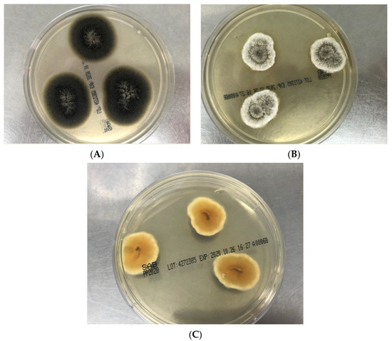 (A): Flat, spreading olive-grey to black colored and suede-like surface (obverse view) of Lomentospora prolificans on Sabouraud dextrose agar (SDA) after four days growth at 28 °C. (B): Greyish-white cottony to woolly surface with concentric growth pattern and white margins (obverse view) of Scedosporium aurantiacum on SDA after 3 days growth at 28 °C. (C): Brown orange center with pale yellow pigment (reverse view) of Scedosporium aurantiacum on potato dextrose agar after 3 days incubation at 28 °C.