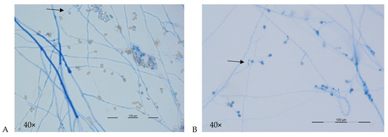 A and B: Microscopic morphology of Scedosporium aurantiacum (A) and Lomentospora prolificans (B) 40x magnification. (A) Hyphae are septate with simple long conidiophores (arrow) bearing conidia singly or in small groups. Conidia (4–9 × 6–10 μm) are single-celled, pale brown ovoid in shape and are rounded above with truncated bases. (B) Hyphae are hyaline and septate with conidia born in small groups on basally swollen, flask-shaped conidiophores (arrow). Conidia (2–5 × 3–7 μm) are hyaline to pale brown, one-celled and oval-shaped with smooth walls.