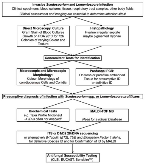Molecular techniques are increasingly used to directly detect Sceodosporium/Lomentospora DNA in clinical specimens followed, typically by DNA sequencing or barcoding to identify the causative species. The use of proteomic approaches, e.g., matrix-assisted laser desorption ionization time-of-flight mass spectrometry (MALDI-TOF MS) have replaced phenotypic methods as a first line for species identification in many laboratories, backed up by molecular approaches. At present, serological methods have little role in routine diagnosis.