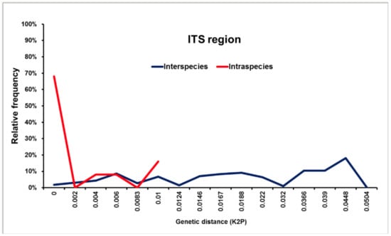 Distribution of interspecies (blue line) and intraspecies (red line) pairwise Kimura 2-parameter genetic distances in the genus Scedosporium based on the primary fungal DNA barcode the ITS1/2 region, based on 60 ITS1/2 sequences of Scedosporium angustum, Scedosporium aurantiacum, Scedosporium apiospermum, Scedosporium boydii, Scedosporium cereisporum, Scedosporium dehoogii, Scedosporium desertorum, Scedosporium ellipsoideum, Scedosporium fusoideum and Scedosporium minutisporum. No DNA barcoding gap was identified using the ITS1/2 region. All taxa were subjected to pairwise sequence divergence calculations using the Kimura 2-parametric distance model (K2P) in MEGA ver. 5.2.2.