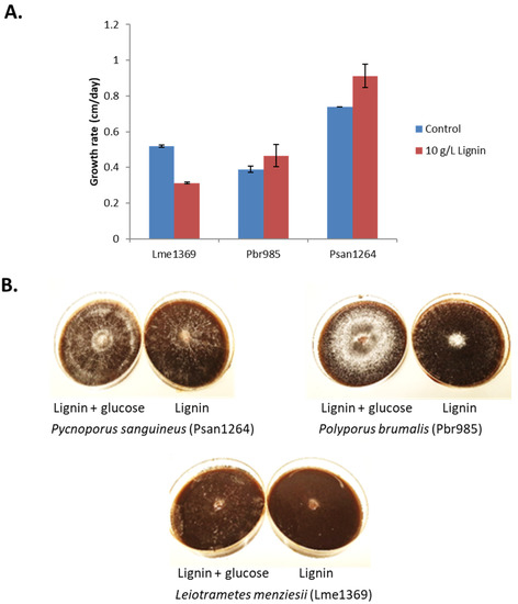 From agar slants, the basidiomycetes strains were transferred and grown on agar plates containing 20 g·L−1 malt extract and 1 g·L−1 yeast extract. Disc cuts of 0.5 cm from the growing mycelium edge were then used to inoculate minimal media plates containing 10 g·L−1 technical soda lignin. The minimal media contained 0.3 g·L−1 NaNO3, 0.026 g·L−1 KCl, 0.026 g·L−1 MgSO4·7H2O, 0.041 g·L−1 KHPO4, 0.00044 g·L−1 ZnSO4·7H2O, 0.00022 g·L−1 H3BO3, 0.0001 g·L−1 MnCl2·4H2O, 0.0001 g·L−1 FeSO4·7H2O, 0.000032 g·L−1 CoCl2·6H2O, 0.000032 g·L−1 CuSO4·6H2O, 0.000022 g·L−1 (NH4)6Mo7O24·4H2O, 0.001 g·L−1 Na2EDTA and 20 g·L−1 agar. Control plates were supplemented with 1 g·L−1 glucose. Fungal growth was followed daily over 14 days by measuring the radial expansion of the fungi (cm·day−1) and the surface mycelial density was observed. All cultures were performed in duplicate.