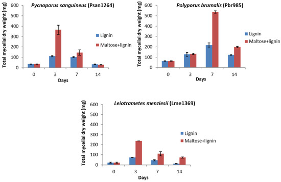 Mycelial dry weight determination in liquid cultures. Determined mycelial dry weights for Psan1264, Pbr985 and Lme1369 in control (maltose 2.5 g·L−1 + lignin 15 g·L−1) and 15 g·L−1 lignin conditions at days 0, 3, 7 and 14 after inoculation. Values are the means of three samples and bars representing the standard deviations.