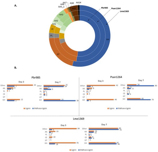 Distribution of predicted CAZymes in the genomes and secretomes of the studied fungi: (A) distribution of CAZymes in the genomes of Pbr985 (inner ring), Psan1264 (middle ring) and Lme1369 (outer ring); (B) number of different CAZymes detected in the secretomes in lignin and in maltose + lignin conditions at days 3 and 7 of growth for the three tested strains. AA, auxiliary activity enzymes; GH, glycoside hydrolases; GT, glycosyl transferases; PL, polysaccharide lyases; CE, carbohydrate esterases; AA1, multicopper oxidases; AA2, class II lignin-modifying peroxidases; AA3, glucose-methanol-choline (GMC) oxidoreductases; AA5_1, copper radical oxidases; AA6, 1,4-benzoquinone reductase; AA7, glucooligosaccharide oxidases; AA9, AA11 and AA14 lytic polysaccharide monooxygenases; AA12, pyrroloquinoline quinone-dependent oxidoreductase.