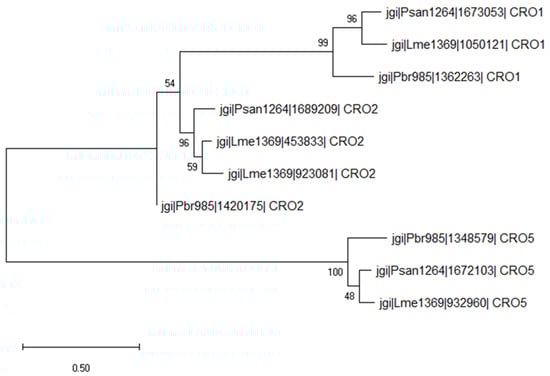 Evolutionary analysis by the maximum likelihood method of secreted AA5_1 proteins. The evolutionary history was inferred by using the maximum likelihood method and Poisson correction model. The tree with the highest log likelihood (−12,807.31) is shown. The percentage of trees in which the associated taxa clustered together is shown next to the branches. Initial tree(s) for the heuristic search were obtained automatically by applying the neighbor-join and BioNJ algorithms to a matrix of pairwise distances estimated using a JTT model, and then selecting the topology with the superior log likelihood value. Evolutionary analyses were conducted in MEGA X [36].