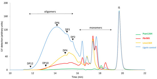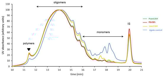 Further evidence of the activity of the strains towards the phenolic substrate was ascertained through the analysis of the insoluble lignin fractions present in the centrifugation pellets. HPSEC indicated the consumption by all strains of almost all the phenolic monomers (eluted between 17 and 19 min) present in the culture pellets (Figure 6). In addition, a reduction in the relative proportion of lower molar mass oligomers (retention time between 14 and 16 min) was observed, specifically with Psan1264 and Pbr985, in parallel with an increase in the relative proportion of the higher molar mass oligomers and of the polymers (retention time between 11.5 and 14 min). This result confirms some similarity in the activity of Psan1264 and Pbr985 compared to Lme1369 and suggests that they were able to modify at least the lower molar mass compounds of the technical lignin insoluble fraction.