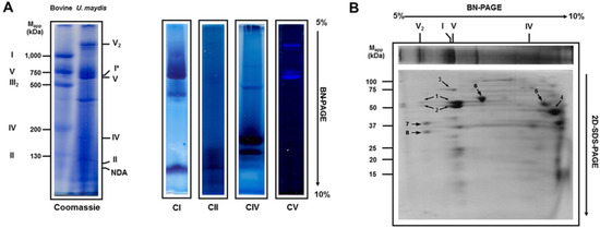 In-gel activity of Ustilago maydis respiratory complexes solubilized by DDM. Mitochondria were solubilized using DDM (2 g/g protein) and respiratory complexes were separated by BN-PAGE, followed by 2D SDS-PAGE. (A) BN-PAGE. The left panel shows the Coomassie-stained gel strips from the BN-PAGE of bovine heart and U. maydis mitochondrial respiratory complexes. In the right panel, CI, CII, CIV, and CV correspond to the in-gel activity assays of complexes I, II, IV, and V, respectively. Bovine heart mitochondria complexes were solubilized with DDM as described under the Materials and Methods section and used as the molecular weight standards. (B) For the identification of some of the respiratory chain complex subunits, proteins were resolved by 2D SDS-PAGE and analyzed by mass spectrometry. Numbers on the gel indicate the following: 1 and 2: α (UMAG_10213) and β (UMAG_10397) subunits of the ATP synthase, respectively; 3: the 75 kDa protein of complex I (UMAG_10695); 4: subunits QCR1 (UMAG_11590) and QCR2 (UMAG_01478) of complex III; 5: LPD1-dihidrolipoamide dehydrogenase (UMAG_02461) and 2-methylcitrtate dehydratase (UMAG_06344); 6: heat-shock protein HSP60 (UMAG_05831); 7: prohibitin PHB2 (UMAG_05030); 8: prohibitin PHB1 (UMAG_11092).