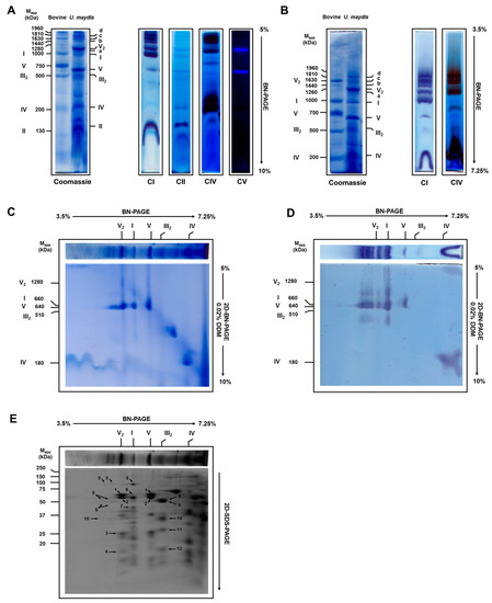 - Jung, C.; Higgins, C.M.; Xu, Z. Measuring the Quantity and Activity of Mitochondrial Electron Transport Chain Complexes in Tissues of Central Nervous System Using Blue Native Polyacrylamide Gel Electrophoresis. Anal. Biochem. 2000, 286, 214–223. [Google Scholar] [CrossRef]