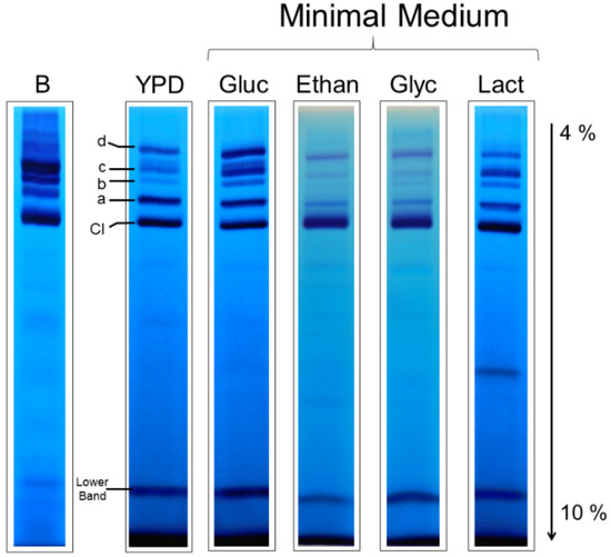 Based on the hypothesis that supercomplexes are responsible for higher efficiency in the electron transfer, which in turn should affect the rate of ATP synthesis, and given the fact that different proportions of complex IV were observed in S. cerevisiae cultured in the presence of different oxygen concentrations [30], we studied the effect of the carbon source on the composition of supercomplexes in U. maydis based on the fact that the growth rates—and thus the need for ATP—can change at least an order of magnitude among the selected conditions [31]. Duplication times in YPD and MM-glucose-NH4+ are around 2 h, 4 h in MM-etnanol-NH4+, and in MM-glycerol-NH4+ and MM-lactate-NH4+, duplication times are about 20 and 30 h, respectively [31]. Figure 3 shows that the same types of supercomplexes were found in the cells growing in glucose, ethanol, glycerol, or lactate despite the large differences in growth rates.