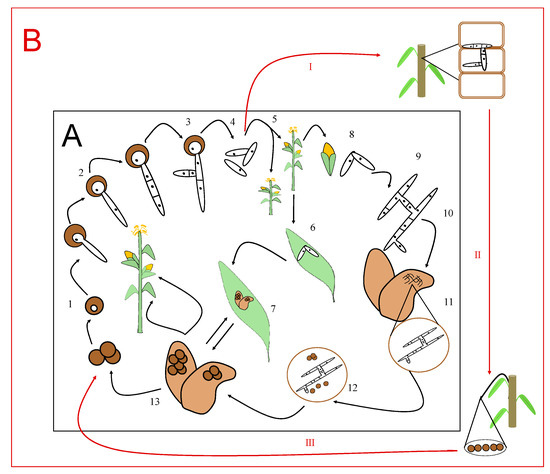 Although there are variations in the Ustilaginales’ cycles, there are some common characteristics for the whole group (Figure 2A). The cycle includes, first, the production of teliospores within the host tissue [12]. After maturing, the teliospores, which are gathered in the sori, undergo karyogamy, by which their two haploid nuclei fuse to form a diploid [13], while acquiring a thick, dark wall that forms a blackish powdery mass reminiscent of smut.