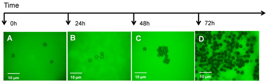 Many times, QS molecules cause variations in the regulation of gene expression as a response to cell density [29] to promote invasion under optimal conditions. Interestingly, Vitale et al. [30] reveal the role of peptide pheromones in cell density regulation in Fuxarium oxysporum development. In a similar way, Sanchez-Elordi et al. [31] have shown that S. scitamineum spores in an aqueous medium secrete a glycosylated enzyme with arginase activity that binds to wall receptor points that are similar or identical to those described by Millanes et al. [32] and interact with sugarcane defense proteins. This arginase seems to have different domains of interaction with these ligands in such a way that the enzyme can adhere to one or several teliospores, producing a cytoagglutination effect. Cytoagglutination has been described as a quorum signal since the S. scitamineum arginase accelerates the germination of the group when it binds to the teliospore cell wall [33]. Figure 3 shows the aggregation of teliospores over time. These images were obtained after the incubation of teliospores in Lilly–Barnett medium from 0 to 72 h. During this time, the spores began to germinate and produce arginase.