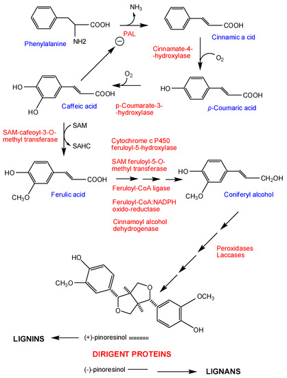 S. scitamineum possess a diverse range of effectors that are directed toward manipulating the host metabolism [21,35,36] and to defending itself from the plant’s immune system. From active-growing mycelium S. scitamineum, a group of proteins that develop a biological action on the host tissues has been isolated via extraction in aqueous medium and penetrability chromatography [37]. The most active fraction (fraction 5) only contained protein, while the rest of the fractions, of which the most active were 6 and 7, were glycoproteins. After incubating the leaf discs of the smut-sensitive Barbados (B) 42231 cv. and the resistant Mayarí My 55-14 cv. in solutions of these fractions, it was observed that the total phenol content was similar in the control discs of untreated and treated plants at time zero, but it increased notably after the incubation of the discs with the protein of fraction 5, and to a lesser extent, although very significantly, with the glycoproteins contained in fractions 6 and 7. The varietal difference implies a greater accumulation of free phenols in the leaves of the sensitive cultivar. This increase somehow corresponds to the activation of the phenylalanine ammonia lyase (PAL) enzyme, which is higher in My 55-14 than in B 42231, as well as the peroxidase (POX) system. The lower PAL activity in the sensitive cultivar could be related to the levels of caffeic acid and its derivative, chlorogenic acid, which remain high in cv. B 42231 but not in cv. My 55-14. The accumulation of caffeic acid will then produce a feedback inhibition of the PAL such that its detectable activity levels in the sensitive varieties would be lower. This would indicate that virulence factors, i.e., both proteins and glycoproteins, would activate phytoalexin synthesis in the sensitive cultivar (phenols derived from hydroxycinnamic acids, such as flavonoids or tannins), while in the resistant cultivar, phenols derived from a PAL activity would be preferentially directed toward lignin and lignan synthesis, in which peroxidases play an essential role (Figure 4). In this sense, the production of lignans has been considered a defense factor of the plant, in addition to the production and secretion of defense proteins [38]. In fact, the way in which sugar cane plants direct their resources to lignin/lignan synthesis by means of the regulation of dirigent protein levels seems to be critical in the early defense of resistant My 55-14 cvs. [38,39].