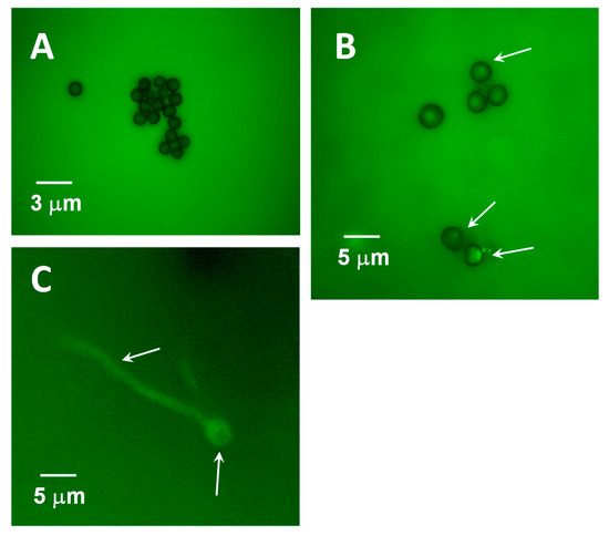 The main cellular event that precedes the germination of smut teliospores is the establishment of cell polarity [56]. These results are in agreement with those obtained by Bachewich and Heath [57], who demonstrated that F-actin participates in such polarization and in the beginning of the protrusion of the end of a nascent hypha in Saprolegnia ferax. Millanes et al. [58] found a total absence of cell polarization in non-germinated, resting teliospores, as revealed by the absence of staining of F-actin with fluorescein isothiocyanate (FITC)-labeled phalloidin (Figure 5A), but G-actin molecules began to polymerize and polarize after teliospore incubation in Lilly–Barnett medium (Figure 5B). After staining with FITC-phalloidin, actin capping marked the site on the teliospore wall through which the germ tube emerged (Figure 5C).