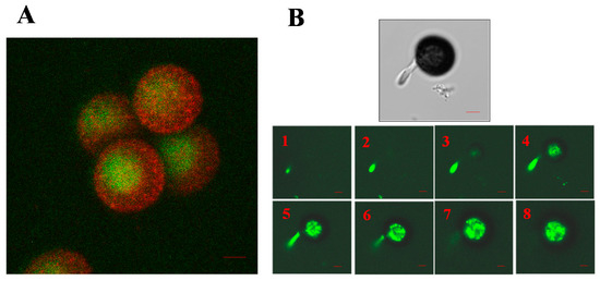 (A) Image obtained using confocal microscopy that displays to a group of teliospores. The green color corresponds to Alexa-Fluor®-488-conjugated phalloidin labeling. The red color corresponds to labeling with an anti-phosphorylated MLC-Ser19 antibody. Scale bars indicate 2 µm. (B) Series of images obtained using confocal microscopy that displays a germinating teliospore labeled with Alexa-Fluor®-488-conjugated phalloidin. Scale bars indicate 2 µm.