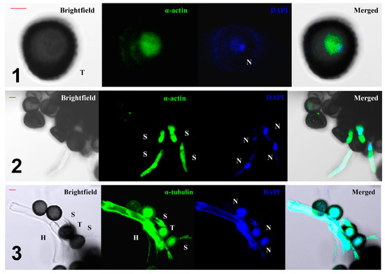 Confocal series (z-maxprojection) of cells. Brightfield, DAPI, α-actin images, as well as brightfield/DAPI/α-actin composites, are shown in the 1 and 2 series. Brightfield, DAPI, α-tubulin images, as well as brightfield/DAPI/α-tubulin composites, are shown in series number 3 (N—nucleus; H—hyphae; S—sporidia; T—teliospore). Scale bars indicate 2 µm.