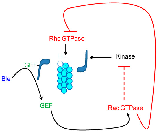 Diagram representing how the presence of blebbistatin (Ble) could trigger the activation of the Rac GTPase by means of the release of their guanosine nucleotide exchange factors (GEFs). The activity of the Rac GTPase would block myosin phosphorylation via the corresponding kinase. In turn, the Rac GTPase inhibition would stimulate Rho GTPase activation and polymerization of the actin.