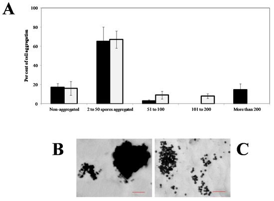 Cytoagglutination degree (number of teliospores per aggregate and number of total aggregates in the media) that was induced by distilled water (black) or 0.5 µg mL−1 nocodazol (gray). Values are the mean of three replicates. Vertical bars give the standard errors, where larger than the line (A). Teliospores aggregate formation induced by water (B) or nocodazol (C). Scale bars indicate 50 µm.