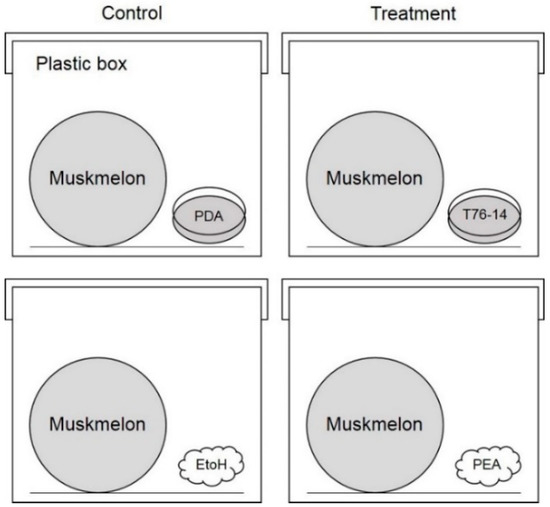 To test the effect of VOCs emitted from T. asperellum T76-14 on fruit rot in muskmelons, five muskmelon fruits were disinfected with 70% ethanol prior to VOC exposure. Muskmelon fruits were incubated with VOCs from Trichoderma or commercial volatiles, as described in Section 2.6, in a 24 × 35 × 18 cm plastic box to share the atmosphere for seven days. Fruit rot was observed from the day after treatment and recorded.