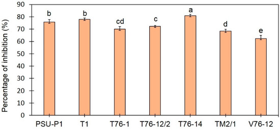 Percentage inhibition of Trichoderma spp. against Fusarium incarnatum in PDA by dual-assay plates. Different letters indicate statistically significant differences among treatments (p < 0.05) using Tukey’s test.