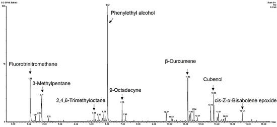Total ion chromatogram of volatile compounds identified from T. asperellum T76-14.