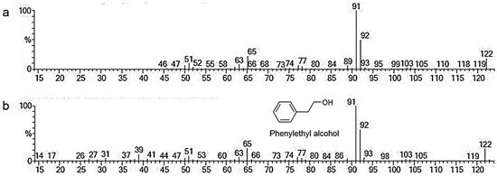 Mass spectrum for the compound at 6.52 min (a) and phenylethyl alcohol (PEA) with its structure (b).