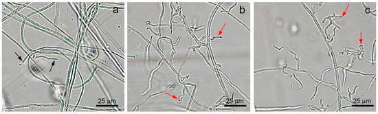 Morphological observation of Fusarium incarnatum mycelia, in control (a), exposed to VOCs emitted by T. asperellum T76-14 (b), and PEA (c), black arrows indicate normal hyphal tips and red arrows indicate abnormal hyphal tips.
