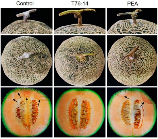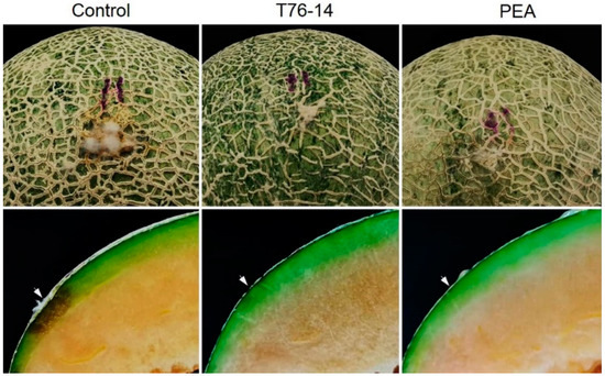 Effect of VOCs and PEA on postharvest fruit rot in muskmelons, T76-14 = Trichoderma asperellum T76-14 and PEA = phenylethyl alcohol. Arrows indicate the rotten tissue.