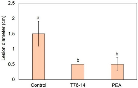 Lesion diameter on muskmelons in the control versus muskmelons exposed to Trichoderma asperellum T76-14 (T76-14) and phenylethyl alcohol (PEA). Different letters indicate statistically significant differences among treatments (p < 0.05) using Tukey’s test.