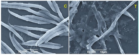 SEM images of F. graminearum spores incubated with sterile water (C) control and treated with GO-AgNPs nanocomposite (T). Images obtained with permission from Chen et al. [38]. (Cited from Chen et al., with permission from ACS).