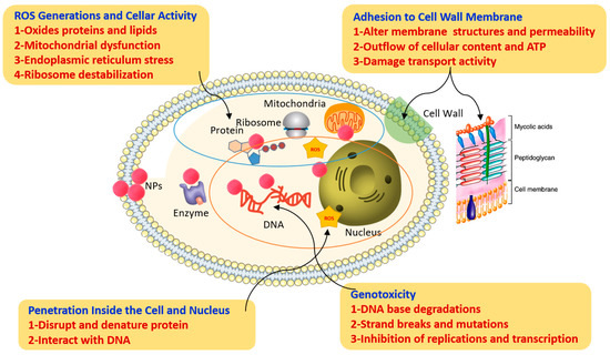 At the molecular level, the nanomaterials interact with various biomolecules and form complexes with different biomolecules thereby causing structural deformation in the biomolecules, inactivation of the catalytic proteins, and nucleic acid abnormalities like DNA breakage, and chromosomal aberrations [57,58]. Reactive Oxygen Species (ROS) play a critical role in antifungal activity mechanism of nano-composite materials. The metal ions trigger ROS and damage the biomolecules leading to cell death. Further, to authenticate the role of ROS in antifungal mechanism; Lipovsky et al. [59] deciphered that the increased expression of lipid peroxidation is a clear indicator of ROS generation. Meanwhile, stress enzymes like superoxide dismutase, glutathione dismutase, ascorbate peroxidase were upregulated/downregulated upon nanomaterials treatment in fungi [60].