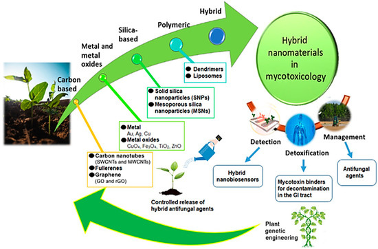 Hybrid-nanomaterial categories used in plant science: carbon nanotubes, including single-walled carbon nanotubes (SWCNTs) and multiwalled carbon nanotubes (MWCNTs), fullerenes); metallic and metal oxide NPs, silica-based nanostructures, and polymeric (dendrimers and liposomes) for the fabrication of biosensors for mycotoxin detection, detoxification of mycotoxin-contaminated food and feedstuffs through binders and management for sustainable control over fungal growth and mycotoxin contamination. (Cited from Thipe et al. with permission from Elsevier).