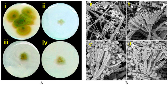 (A) Antifungal activity of Ag-Chit NCs against A. flavus collected from feed samples. (i), control (without nanocomposite treatment), (ii), (iii), and (iv) fungal mat treated with 30, 60, and 90 milligrams of nanocomposites. All petri dishes treatment was incubated at 28 °C for 10 days. (B) Fungal mycelium of P. expansum treated with Ag-Chit NCs referred to the morphological changes in fungal hyphae, SEM images depicted markedly shriveled, crinkled cell walls, and flattened hyphae of the fungi (a), hyphal cell wall and vesicle damaged (b), irregular branching (a and b), and collapsed cell, formation of a layer of extruded material (d) Source (Abd-Elsalam KA. unpublished data).