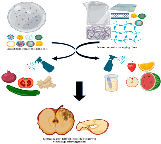 Perishable vegetables and fruits are spoiled due to transport, storage and growth of spoilage and opportunistic microbes. Therefore, microbial decay of fruits and vegetables is a great concern for researchers to formulate a driven strategy control measures with long-standing efficiency. Nanotechnology is an alternative solution to develop sustainable horticulture in preserving and managing post-harvest diseases of fruits and vegetables [74,75]. This technology offers various products such as packaging thin films; helping for labeling fresh products using the multiple chips (nanobiosensors), improvement of packaging appearance and prevention of the impact of gases and unsafe rays.