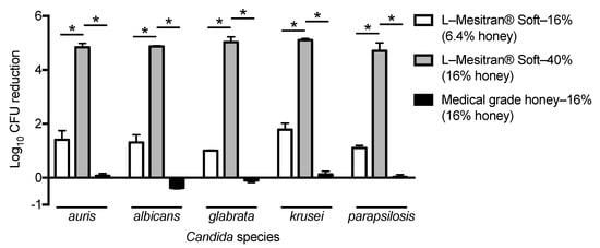 The effect of L-Mesitran® Soft and its honey component on different Candida species. Isolates from five Candida species (n = 3 for each species) were incubated with L-Mesitran® Soft—16% and —40% and medical-grade honey—16%. Data are presented as reduction in CFU. Significant differences (p < 0.05) are indicated with an asterisk.