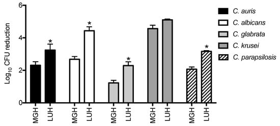 The effect of medical-grade honey vs local honey on the growth of different Candida species. Isolates from five Candida species (n = 3 for each species) were incubated with 40% of medical-grade honey (MGH) or local unprocessed honey (LUH). Data are presented as reduction in CFU. Significant differences (p < 0.05) as compared to MGH are indicated with an asterisk.