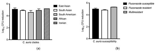 The impact of C. auris traits on antifungal activity of L-Mesitran® Soft. C. auris isolates with (a) different geographic origins, and; (b) different antifungal susceptibilities, were incubated with L-Mesitran® Soft—40%. Multiresistant isolates include those that are resistant to fluconazole and echinocandin and/or amphotericin B. No significant differences were found between groups.