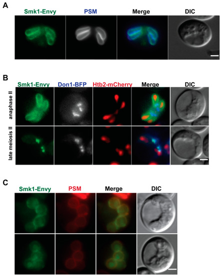 Figure 1. Smk1 exhibits two distinct localizations during prospore membrane development. (A) Smk1-GFPEnvy co-localizes with the prospore membrane (PSM) marker pRS426-Spo2051–91-mTagBFP along the PSM. (B) Smk1-GFPEnvy localizes to PSM during the elongation stage of membrane development, and is concentrated at the leading edge of the prospore membrane after anaphase II. Htb2-mCherry is used as a histone marker. The leading edge of the growing prospore membrane is marked using Don1-BFP. (C) Smk1-GFPEnvy becomes more broadly localized after prospore membranes round up and close. Prospore membranes are in red and are labeled using an integrated Spo2051–91-mKate2 marker. For all strains, the genomic copy of SMK1 is epitope tagged with GFPENVY at its C-terminus; strains are homozygous for SMK1-GFPENVY. Yeast strains used for each panel: (A) LH1116, (B), LH1117, and (C) LH1133. Scale bar = 2 µM.