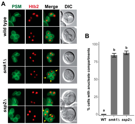 Figure 6. SMK1 and SSP2 are required for late prospore membrane development. (A) Cells with elongated tubular prospore membranes and post-anaphase II rounded prospore membranes are shown in wild type (LH1130), smk1∆ (LH1131), and ssp2∆ (LH1132) cells. Prospore membranes (PSM) are in green and are labeled using an integrated Spo2051–91-GFPENVY marker. Htb2-mCherry was used as a histone marker in LH1131 and LH1132, while Htb2-mRuby2 was used as the histone marker in LH1130. Yellow arrows point to ectopic membrane compartments found in mutant cells with rounded prospore membranes. Scale bar = 2 µM. (B) Quantitation of anucleate compartments. Post-anaphase II cells that had four distinct nuclei and rounded prospore membranes were assayed for the presence of anucleate compartments in wild type (WT; LH1130), smk1∆ (LH1131), and ssp2∆ (LH1132). At least three biological replicates, 100 cells per replicate, were counted for each genotype. Error bars show the standard error of the mean. The wild type strain (a) is significantly different from the smk1∆ and ssp2∆ strains (b); one way ANOVA (F(2,8) = 549, p < 0.001) followed by Tukey’s HSD post hoc test (alpha = 0.01).