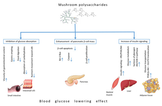 Bearing in mind that dietary polysaccharides and EPS purified from mushrooms represent main bioactive compounds, which can regulate glucose homeostasis and reduce the complications of diabetes, we summarized the literature based on the anti-hyperglycemic mechanisms of their action (Figure 2).