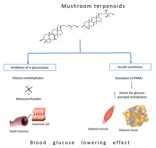 Terpenes are known as an important bioactive metabolite produced by many higher fungi. They consist of multiple isoprene units (containing five carbon atoms) and are usually grouped according to the number of isoprene (C5H8) units in the monoterpenes, sesquiterpenes, diterpenes, sesterpenes, triterpenes, tetraterpenes, and politerpenes [72]. The term terpene is often extended to the terpenoids, which are oxygenated derivatives of these hydrocarbons. Diterpenoids, triterpenoids, and sesquiterpenoid are the typical representatives of terpenes with interesting biological activities. Triterpenoids and sesquiterpenoids are mainly common among mushroom metabolites and some of them have homologies with plant terpenoid compounds. Due to their lipophilic nature, triterpenes can bind to cell membranes, thereby affecting their fluidity, which in turn may limit their bioavailability. While they are large molecules, experiments revealed that triterpenoids penetrate both cell membranes and the blood–brain barrier and accumulate in the liver, circulatory system, and other tissues [72]. Moreover, chronic intake of triterpene-rich natural products increases their bioavailability and accumulation in circulation and tissues [73]. Previous studies of the antidiabetic properties of triterpenoids have been associated with inhibition of enzymes actively involved in glucose metabolism, such as aldose reductase and α-glucosidase [74,75].