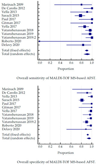 The current methods for the rapid detection of resistance include molecular-based analyses [49,50], flow cytometry [51] or porous aluminum oxide (PAO)-based cultures [52,53], which deliver results within a few hours. Furthermore, the improvement of the conventional methods by the direct inoculation of standard tests with positive blood cultures [54] or shortening the time to result by automated approaches such as as the Vitek 2 yeast panel [55,56,57] have been investigated. However, all of these methods have their own limitations of applicability, diagnostic accuracy or time to result. MALDI-TOF MS has been investigated for application in AFST, as the technology is well established for species identification in routine microbiology. Many diagnostic laboratories are already equipped with a MALDI-TOF MS system, which would facilitate the utilization upon the development of an appropriate assay for AFST. In this meta-analysis, we provide an overview of the recent studies utilizing MALDI-TOF MS for AFST. The overall sensitivity and specificity of MALDI-TOF MS-based AFST has been evaluated at 91% and 95%, respectively. Given the further-expandable amount of data, these results suggest that MALDI-TOF MS is a promising new tool for rapid AFST.