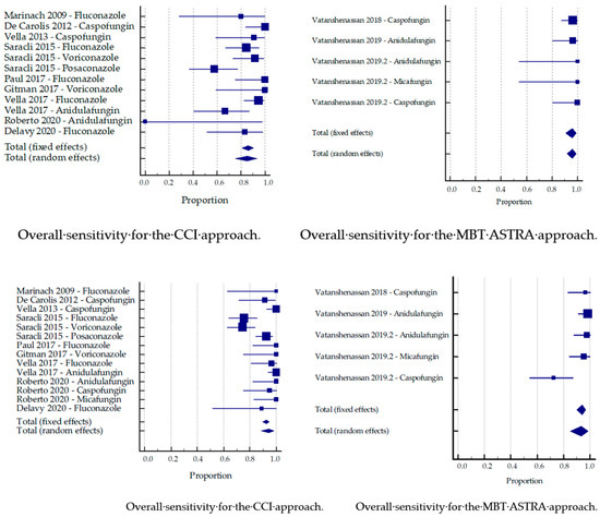 A subclassification into the two technical approaches was applicable for echinocandins. Again, the MBT ASTRA approach achieved better sensitivity than the CCI approach (96% and 93.2%, respectively), while better specificity was obtained by CCI (98.1%, compared to 79% for MBT ASTRA). Inversely, analyzing only studies based on the CCI approach, no significant difference in sensitivity between the two antifungal groups could be observed (84.4% for azoles vs. 83.3% for echinocandins). The specificity was still higher in the echinocandin group (97.3% vs. 92.3% for azoles).