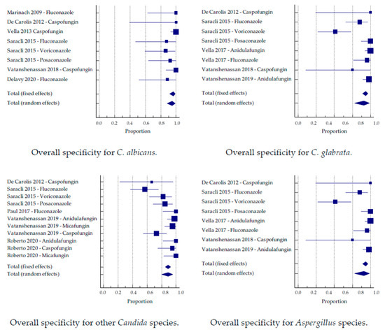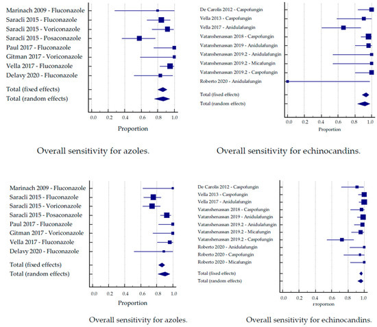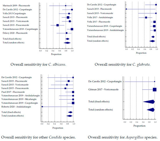 The largest number of isolates was tested for caspofungin, with 104 resistant and 157 susceptible Candida and Aspergillus strains of different species. The highest sensitivity was reached for micafungin; however, only one study—with merely six resistant isolates—was suitable for analysis (Table 2). Micafungin also showed the best combined sensitivity and specificity. The highest specificity was achieved for anidulafungin. The lowest sensitivity was shown for posaconazole, and the lowest specificity was shown for voriconazole.