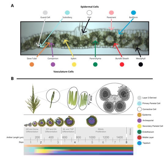 (A) A transverse image of a hand section of an adult leaf with different cell types labeled: bundle sheath, mesophyll, epidermal cells (guard cells, subsidiary, hair, pavement, bulliform), and vasculature cells (sieve tube, companion, xylem, parenchyma). (B) Tassels contain many paired spikelets with two florets with three anthers each. Anthers are composed of four lobes joined with vasculature as shown in a transverse section. The time course of anther development is segmented into grey boxes on the basis of differentiation and proliferation of key cell types with anther length and time shown for reference. Anther lobes were traced from confocal images with different cell types filled in colors corresponding to the legend. The colored bars correspond to differentiation of different cell types over time. (A) was provided by Susanne Matschi and (B) is reprinted from [5].