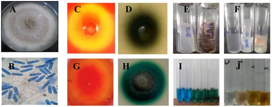 Figure 1. Screening for the lignocellulolytic potential of the strain OH. (A). Colony morphology of OH on PDA plate after 7 days at 30 °C; (B) microscopic appearance at magnification 100×; after 7 days at 30 °C; and (CJ) lignocellulolytic enzyme profile of OH. (C) Cellulose hydrolysis on CMC agar on the 3rd day of screening; (D) BGL plate screening using esculin as a substrate; (E,F) cellulose-degrading capabilities in minimal medium containing Whatman filter paper strip. Images after 7 days incubation. (E) Left tube: control without inoculum in solid media and (F) in liquid culture. (G) Screening for xylanase on a xylan agar plate. (H) Laccase activity was tested in an MSM containing ABTS (2-2′-azino-bis (3-ethylbenzothiazoline-6-sulphonic acid). (I) Lignin peroxidase assay with methylene blue, left tube (1st tube): control without culture supernatant and (J) manganese peroxidase assay with methyl catechol, left tube (1st tube): control without culture supernatant.