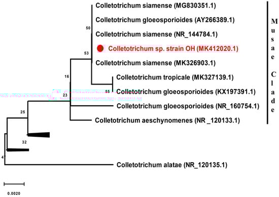Figure 2. Rooted maximum likelihood phylogenetic tree using ITS gene sequences. The phylogenetic tree depicts Colletotrichum sp. strain OH (red filled circle and red text) with Musae clade of Colletotrichum gloeosporioides species complex. Accession numbers are in parentheses; Bootstrap values (based on 1000 replications) are shown at the branch points. Scale bar = 0.0020 substitutions per nucleotide position. A compressed tree is presented for clarity, and the complete tree is presented in Figure S1.