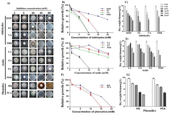 Figure 3. Tolerance of Colletotrichum sp. OH to lignocellulosic-derived inhibitors. (A) The mycelial growth in the presence of three groups of inhibitors; aldehydes, acids, and phenolics (HMF, FU, furfural; VA, vanillin; PHB, p-hydroxybenzaldehyde; LA, levulinic acid; FA, formic acid; GA, gallic acid; POH, p-hydroxybenzoic acid; HQ, hydroquinone; PCA, p-cumaric acid). (B,D,F) is the relative mycelial growth (%) in plates and (C,E,G) dry weight biomass (g/L) of OH on the seventh day when supplemented with and without inhibitors. The control (no inhibitors) plate showed 9 cm mycelial growth on the 7th day of incubation. Experiments were performed in triplicate, and the heights of the bars and the error bars show the means ± standard error mean (SEM).